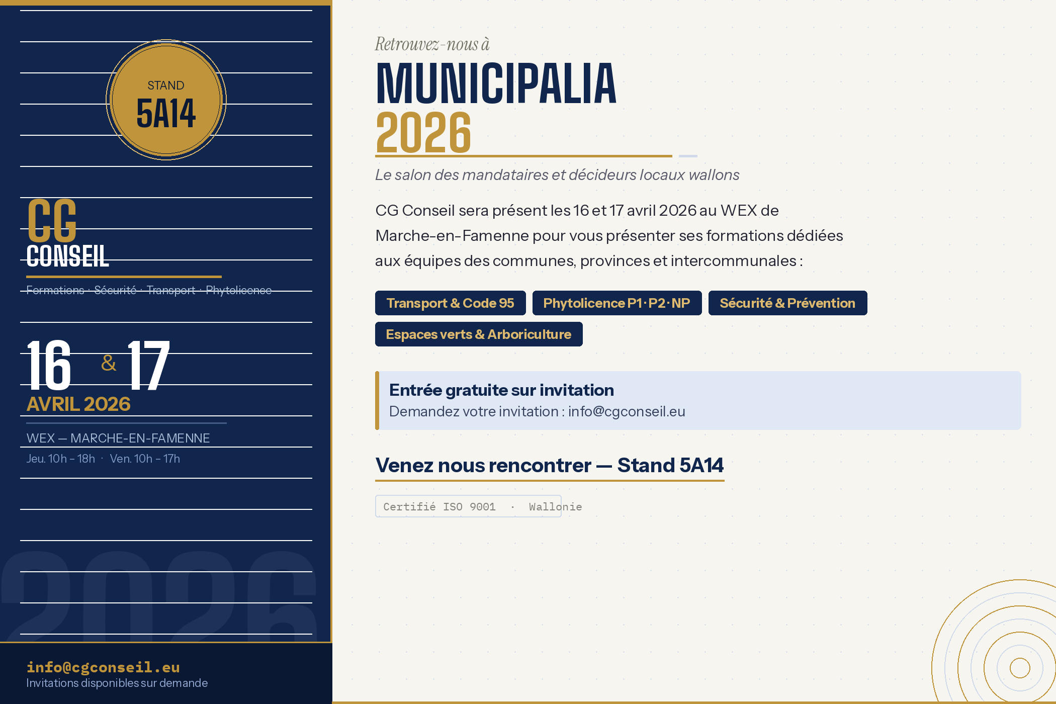 Les 16 et 17 avril 2026, CG Conseil participera au salon Municipalia au WEX de Marche-en-Famenne, le rendez-vous incontournable des mandataires et décideurs locaux wallons. Venez découvrir nos formations sur le stand 5A14 — et profitez d’une invitation gratuite sur demande !